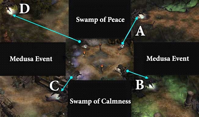 - Khu vực săn bắn: Trong khu vực săn bắn bạn sẽ tìm thấy tất cả các quái vật của Peace Swamp và khi đi đến Khu C bạn sẽ tìm thấy Boss Medusa.