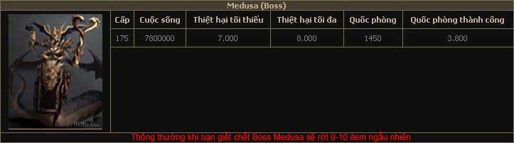 - Quái vật Medusa sống tại vùng đầm lầy chết đã lưu danh trong huyền thoại xa xưa, với ánh mắt hóa đá và sự tàn độc của hắn. Đằng sau sức mạnh khủng khiếp đó chính là những vũ khí, giáp trụ mạnh mẽ và quý giá đã bị Medusa chiếm giữ từ các chiến binh hi sinh trước đây khi tiêu giệt hắn. - Sự kiện Săn Rắn Medusa là một sự kiện vô cùng hấp dẫn và kịch tính không kém gì các sự kiện khác. Các chiến binh Mu hãy cùng khảm phá mảnh đất Đâm Lầy Chết và tiêu giệt Medusa, mang về những báu vật vô cùng quý giá. - Yêu cầu tham gia: cấp độ tối thiểu 400. - Thời gian diễn ra sự kiện: khi có thông báo sự kiện Medusa trong game (hoặc Swamp of Peace Event). Khi sự kiện bắt đầu, bạn phải tiêu diệt được Boss Medusa trong 5 phút nếu không sự kiện sẽ kết thúc. - Phần thưởng: nhiều vật phẩm Exl hấp dẫn.
