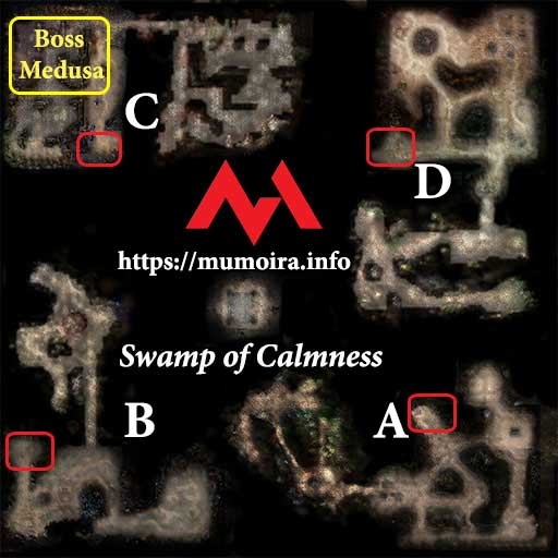 - Các hình chữ nhật màu vàng đánh dấu khu vực nơi có vị trí của Medusa (Boss).